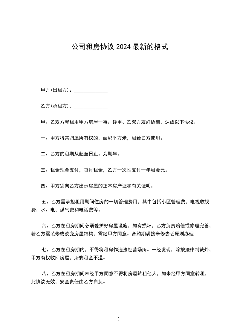 一、甲方同意供给乙方经营用房____平方米,用于该公司经营之用,该房屋坐落于____________.