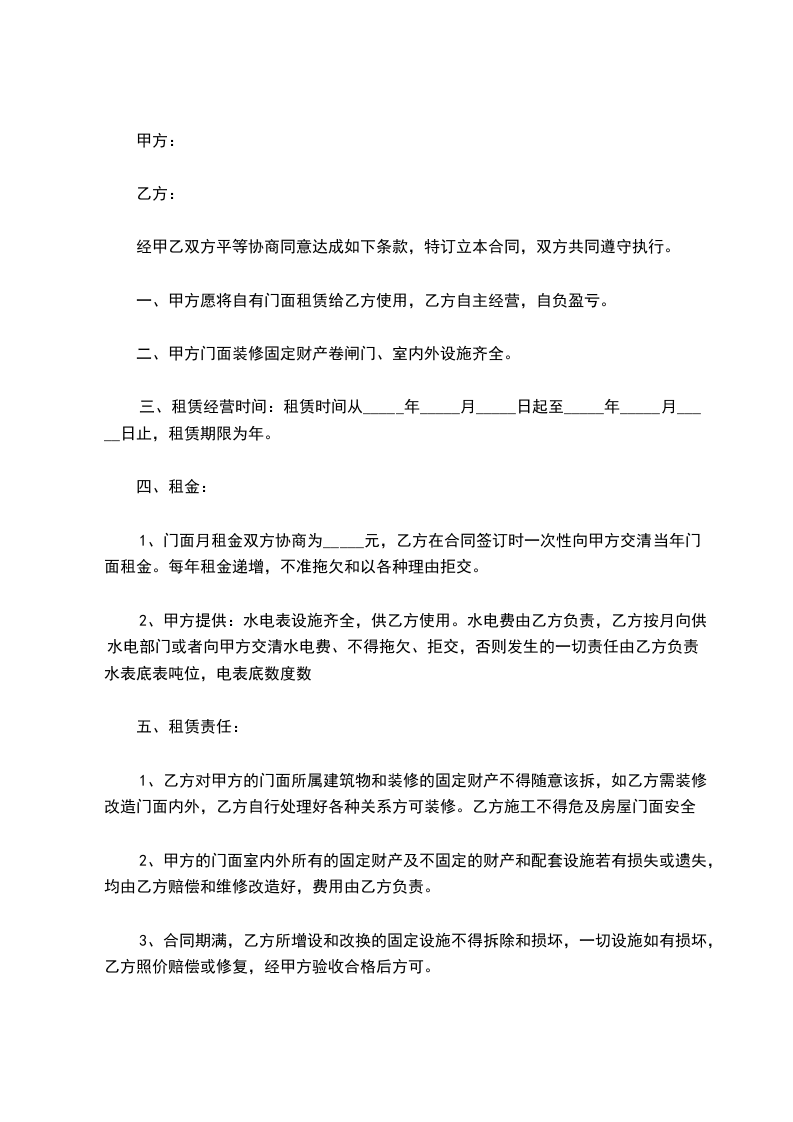 1、门面月租金双方协商为_____元,乙方在合同签订时一次性向甲方交清当年门面租金。每年租金递增,不准拖欠和以各种理由拒交。
