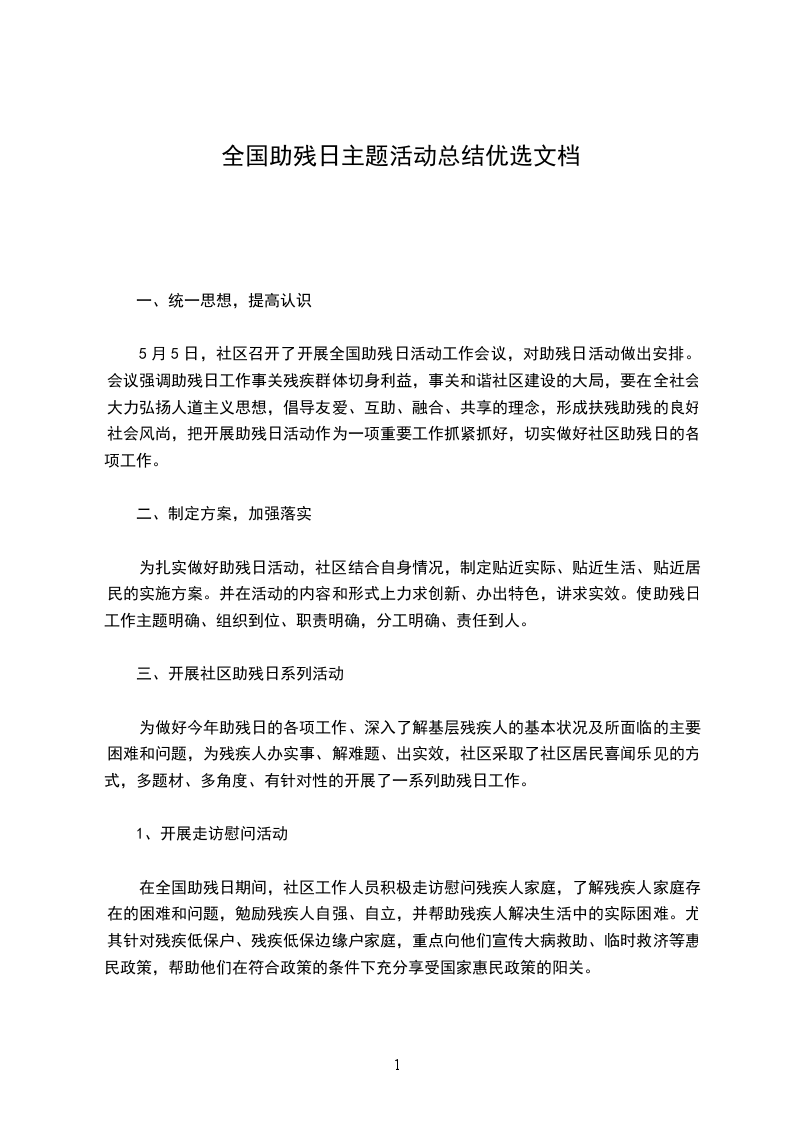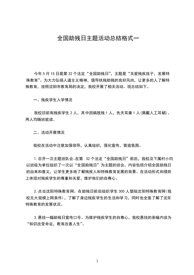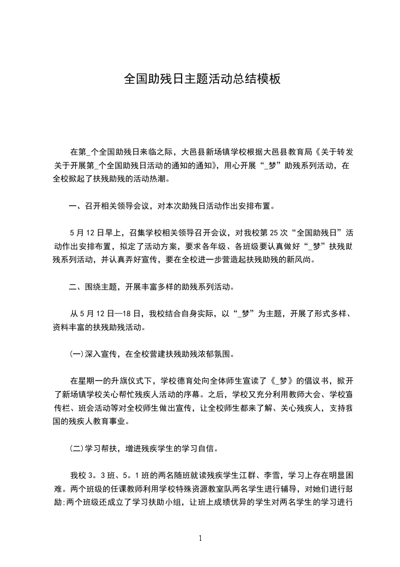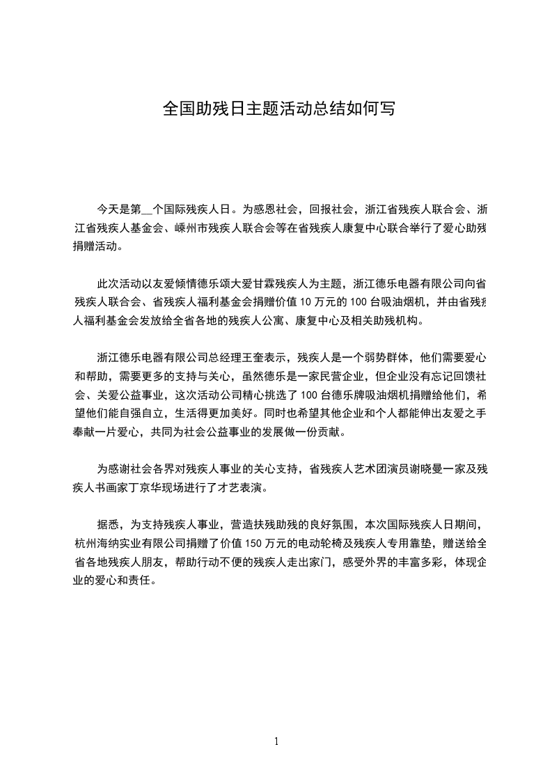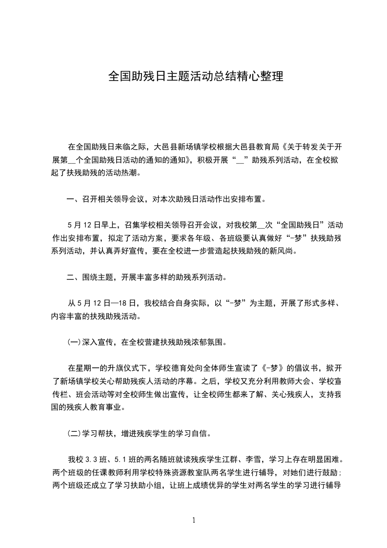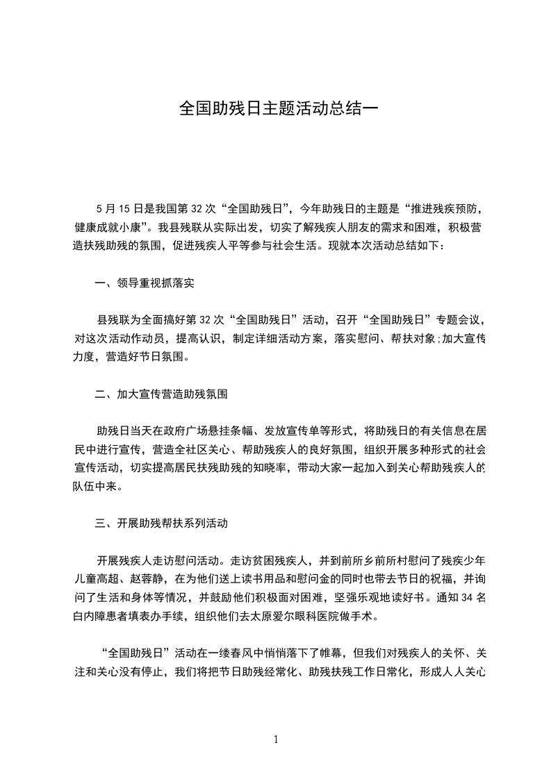 透过第_个“全国助残日”活动的开展,更进一步促进了教师、学生、社区居民对残疾人事业的了解和支持,增进了扶残助残风气的进一步构成,增强了人们的扶残助残意识,从而让全校师生、全社会更加理解、尊重、关心、帮忙残疾人,将我校残疾人工作推上了一个新台阶。