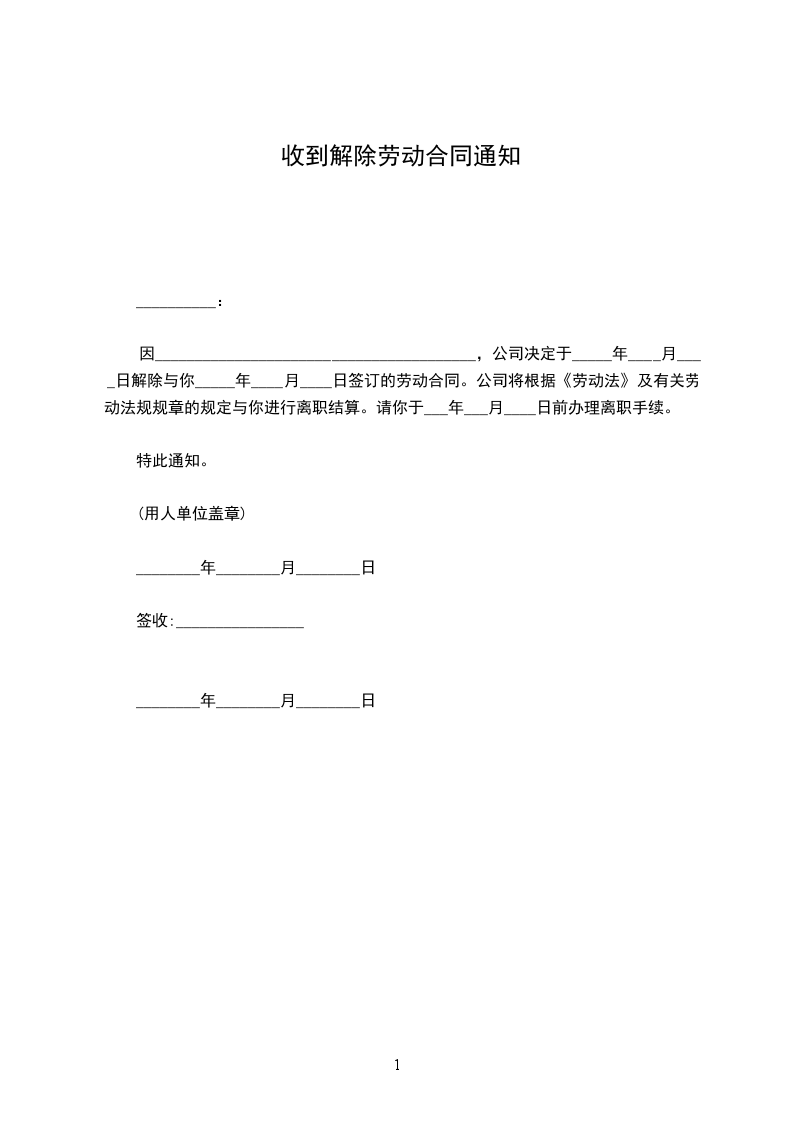 因________________________________________,公司决定于_____年____月____日解除与你_____年____月____日签订的劳动合同。公司将根据《劳动法》及有关劳动法规规章的规定与你进行离职结算。请你于___年___月____日前办理离职手续。