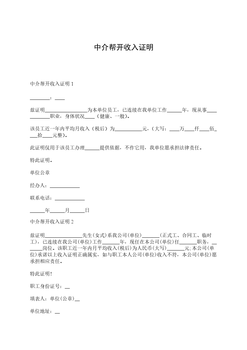 中介帮开收入证明2兹证明_______________先生(女式)系我公司(单位)_______(正式工、合同工、临时工),已连续在我公司(单位)工作_______年,现任在本公司(单位)任_______职务,_______岗位。该职工近一年内月平均收入(税后)为人民币(大写)_______元;本公司(单位)承诺以上收入证明正确属实,如与职工本人公司(单位)收入不符,本公司(单位)愿承担相应责任。