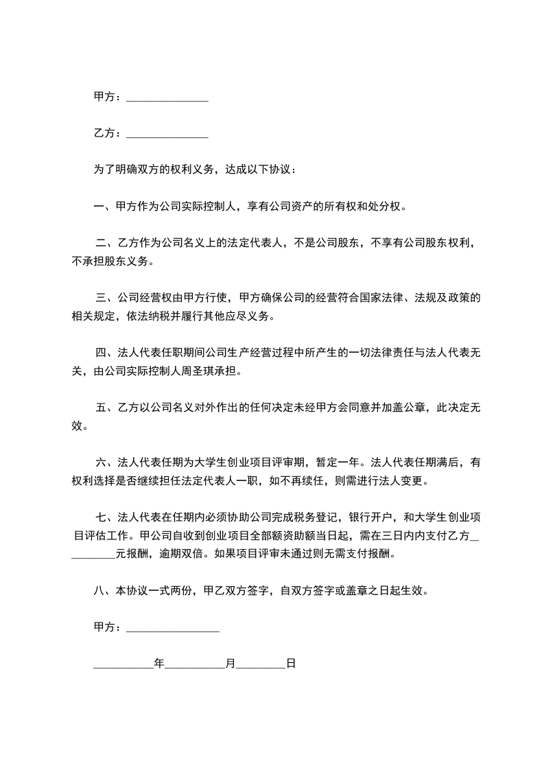 七、法人代表在任期内必须协助公司完成税务登记,银行开户,和大学生创业项目评估工作。甲公司自收到创业项目全部额资助额当日起,需在三日内内支付乙方__________元报酬,逾期双倍。如果项目评审未通过则无需支付报酬。