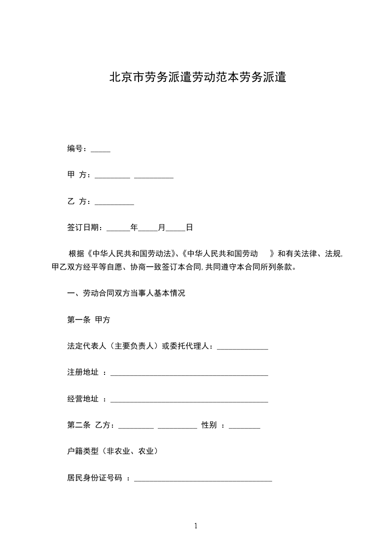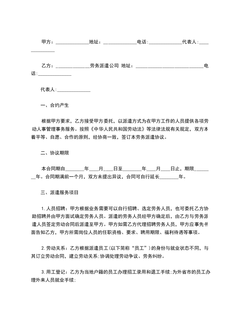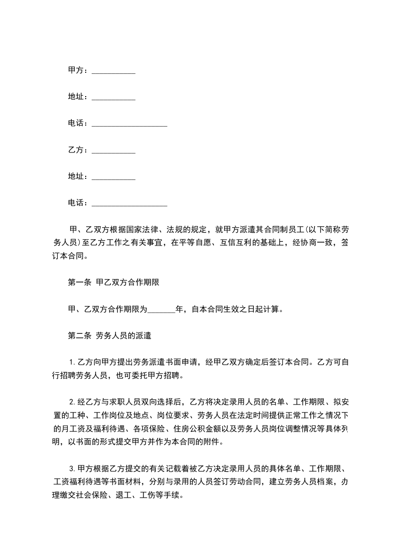乙方:______________劳务派遣公司 地址:____________________________电话:______________