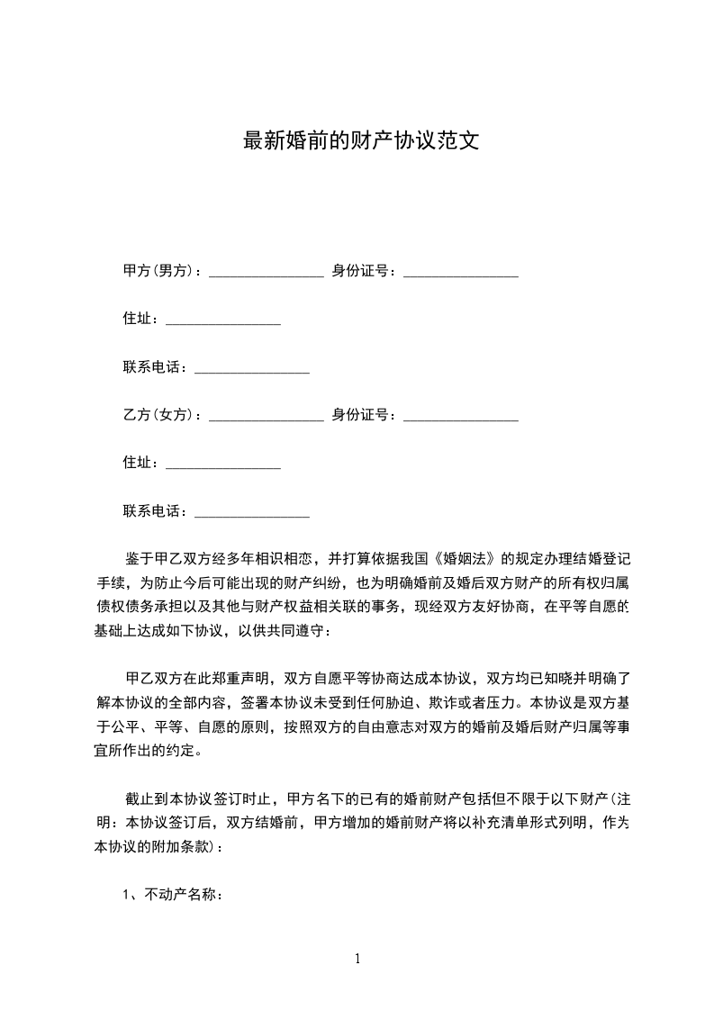 截止到本协议签订时止,甲方名下的已有的婚前财产包括但不限于以下财产(注明:本协议签订后,双方结婚前,甲方增加的婚前财产将以补充清单形式列明,作为本协议的附加条款):