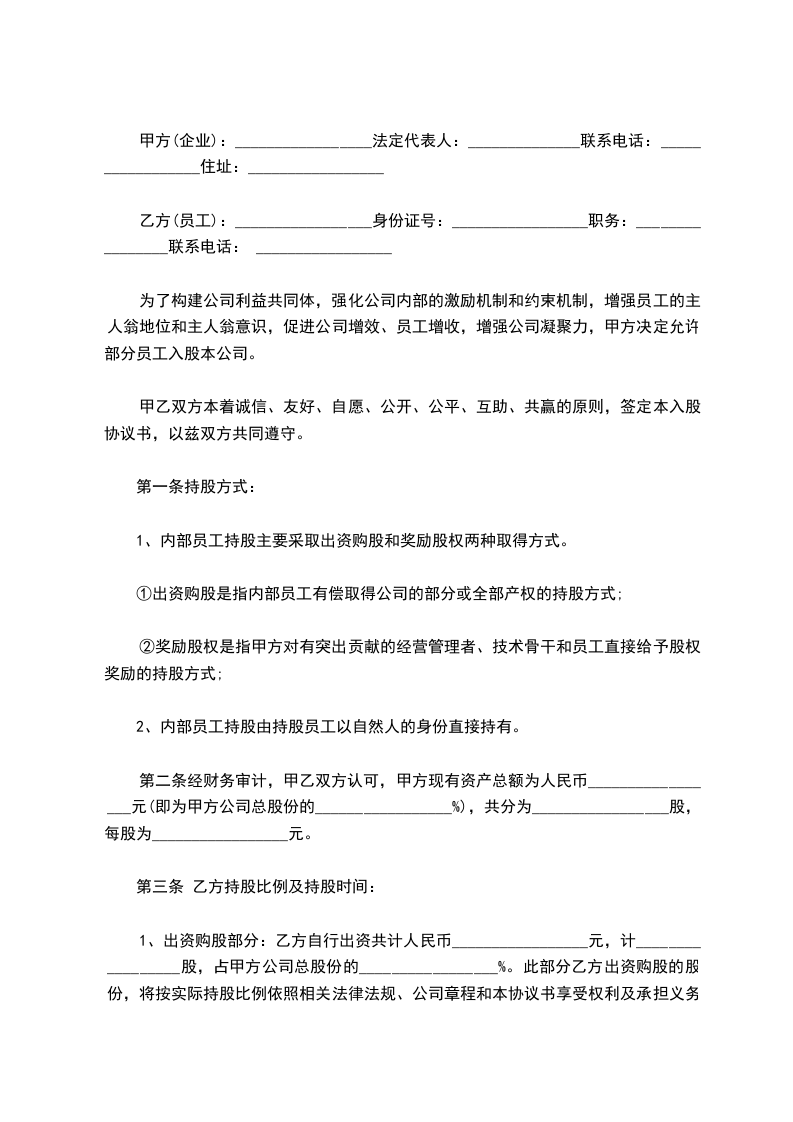 为了构建公司利益共同体,强化公司内部的激励机制和约束机制,增强员工的主人翁地位和主人翁意识,促进公司增效、员工增收,增强公司凝聚力,甲方决定允许部分员工入股本公司。