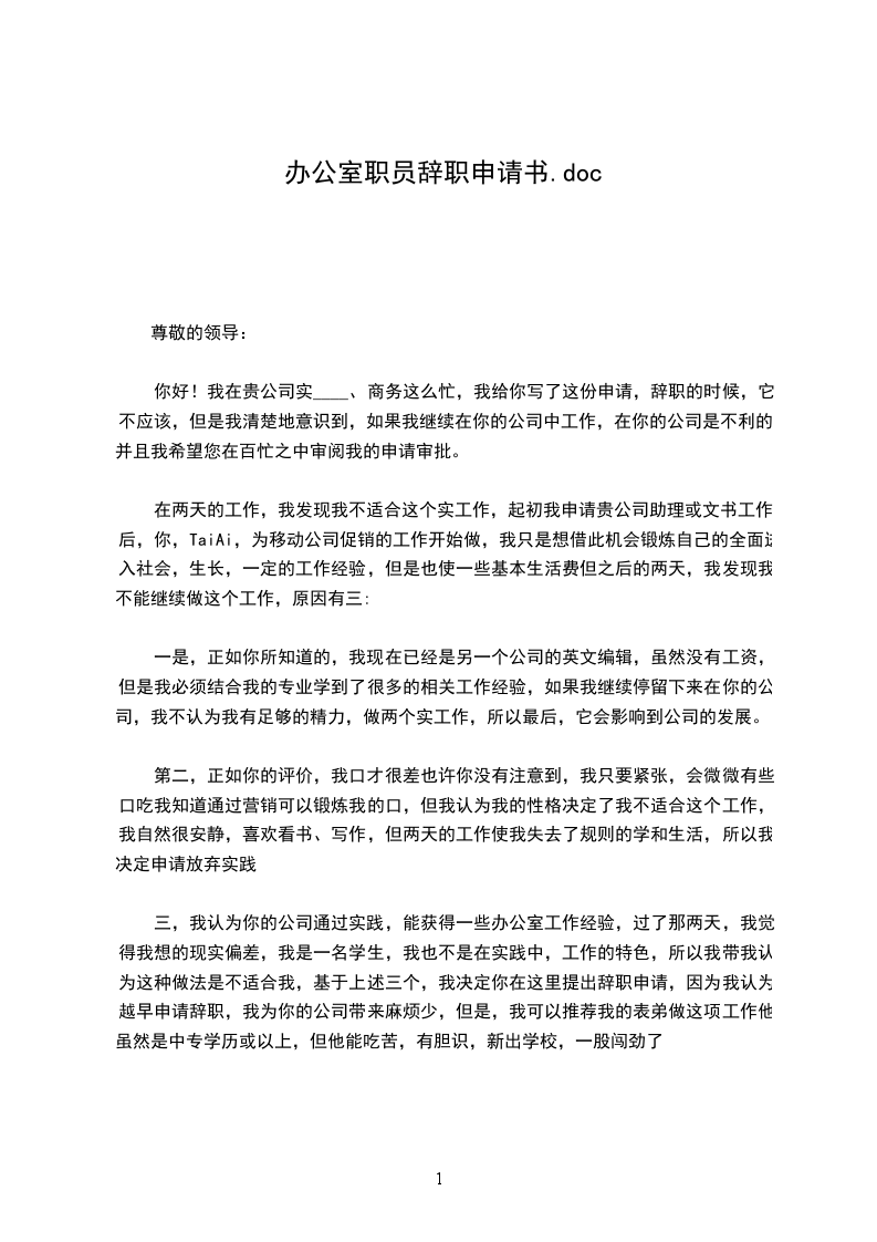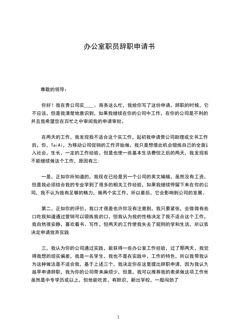 在两天的工作,我发现我不适合这个实工作,起初我申请贵公司助理或文书工作后,你,TaiAi,为移动公司促销的工作开始做,我只是想借此机会锻炼自己的全面进入社会,生长,一定的工作经验,但是也使一些基本生活费但之后的两天,我发现我不能继续做这个工作,原因有三: