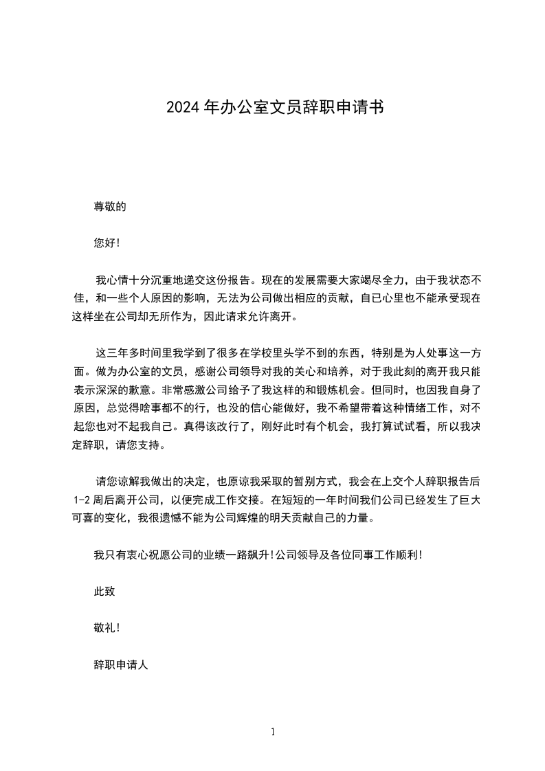办公室职员辞职申请书6