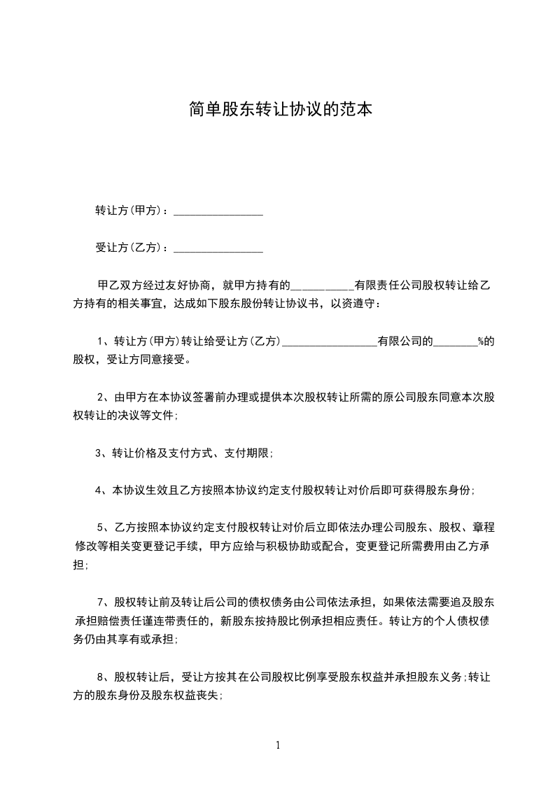 1、转让方(甲方)转让给受让方(乙方)_________________有限公司的________%的股权,受让方同意接受。