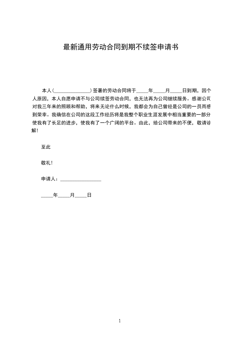 本人(_______________)签署的劳动合同将于_____年_____月_____日到期,因个人原因,本人自愿申请不与公司续签劳动合同,也无法再为公司继续服务。感谢公司对我三年来的照顾和帮助,将来无论什么时候,我都会为自己曾经是公司的一员而感到荣幸。我确信在公司的这段工作经历将是我整个职业生涯发展中相当重要的一部分。使我有了长足的进步,使我有了一个广阔的平台。由此,给公司带来的不便,敬请谅解!
