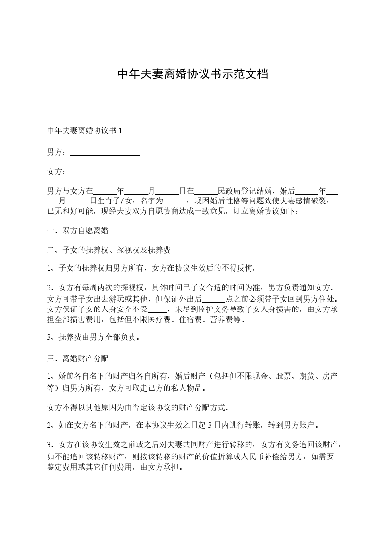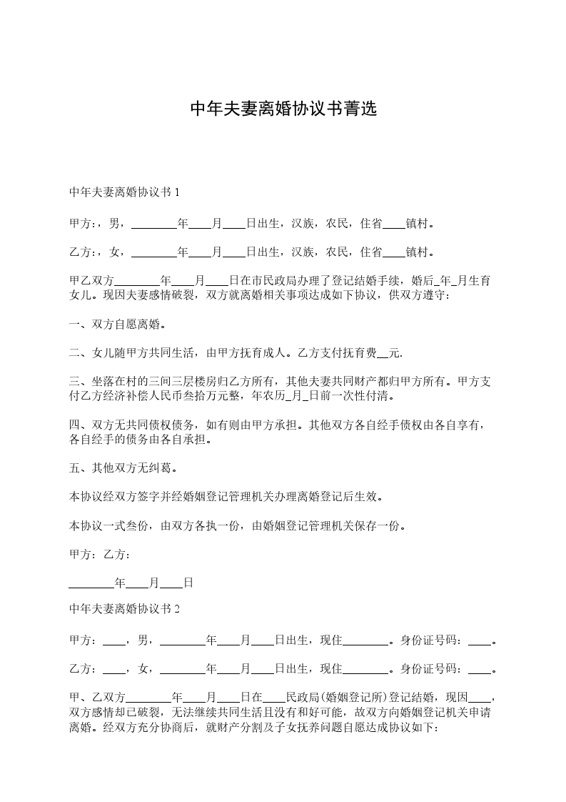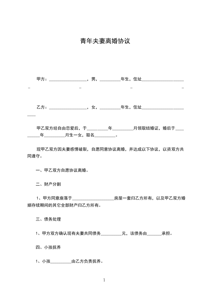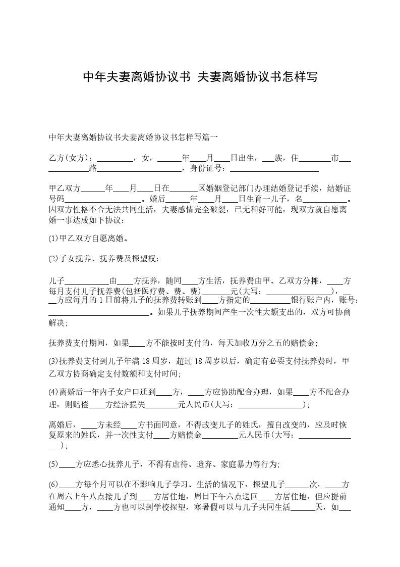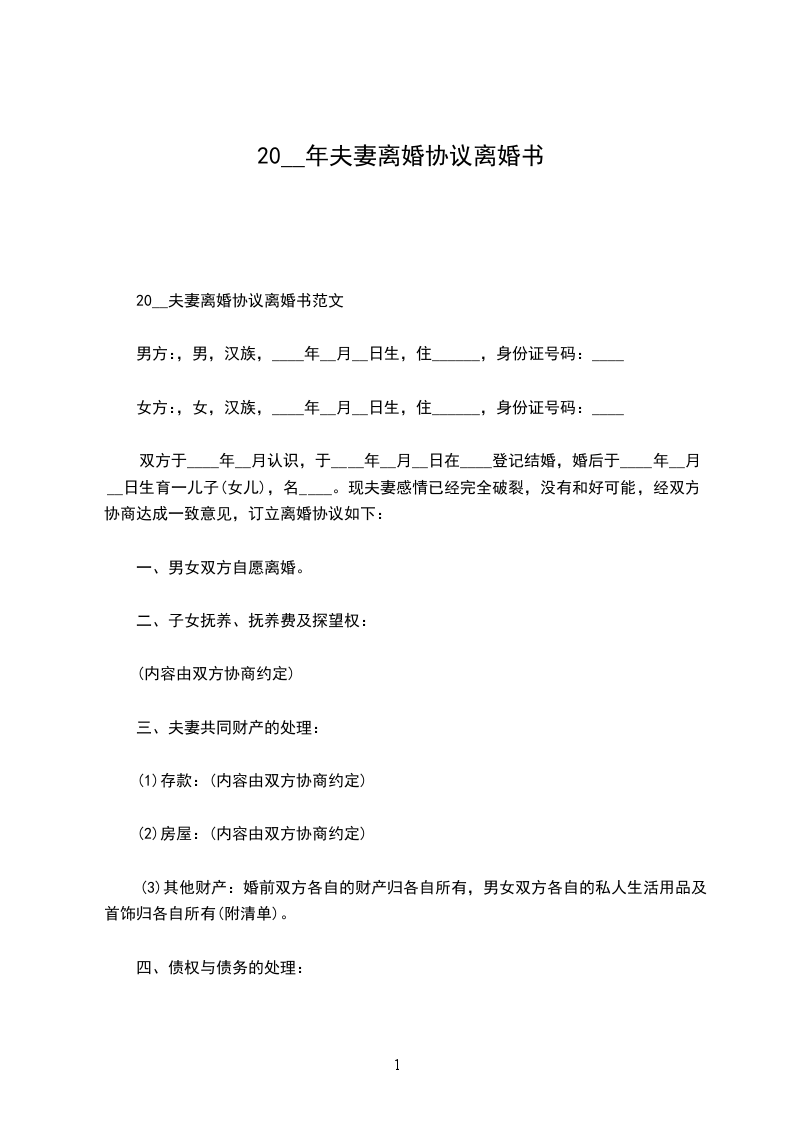 男方与女方于______年______月______日认识,于______年______月______日登记结婚,婚后于______年______月______日生育一儿子(______)一个女儿(______)。因______致使夫妻感情确已破裂,已无和好可能,现经夫妻双方自愿协商达成一致意见,订立离婚协议如下: