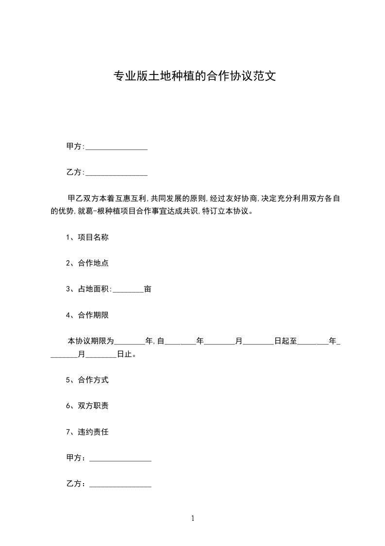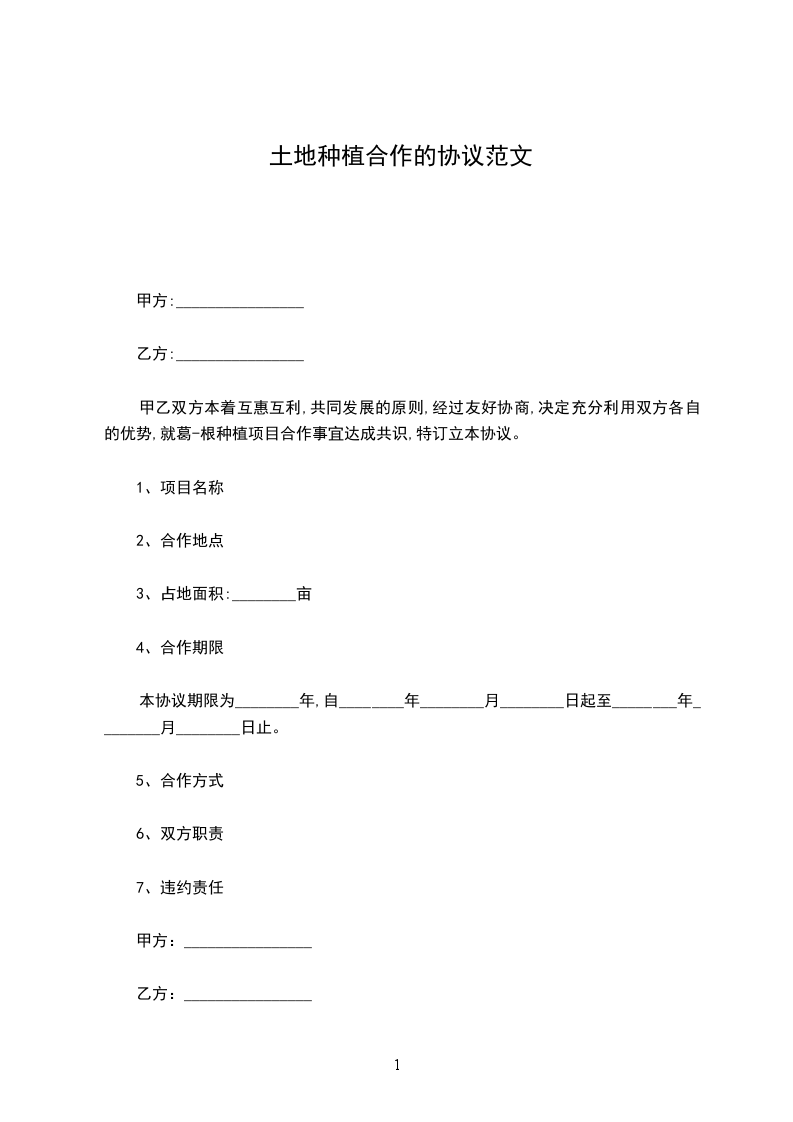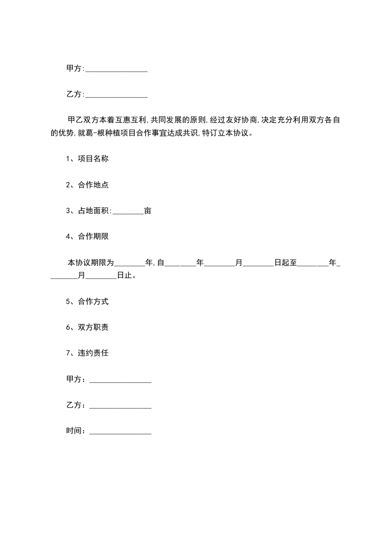 甲乙双方本着互惠互利,共同发展的原则,经过友好协商,决定充分利用双方各自的优势,就葛-根种植项目合作事宜达成共识,特订立本协议。