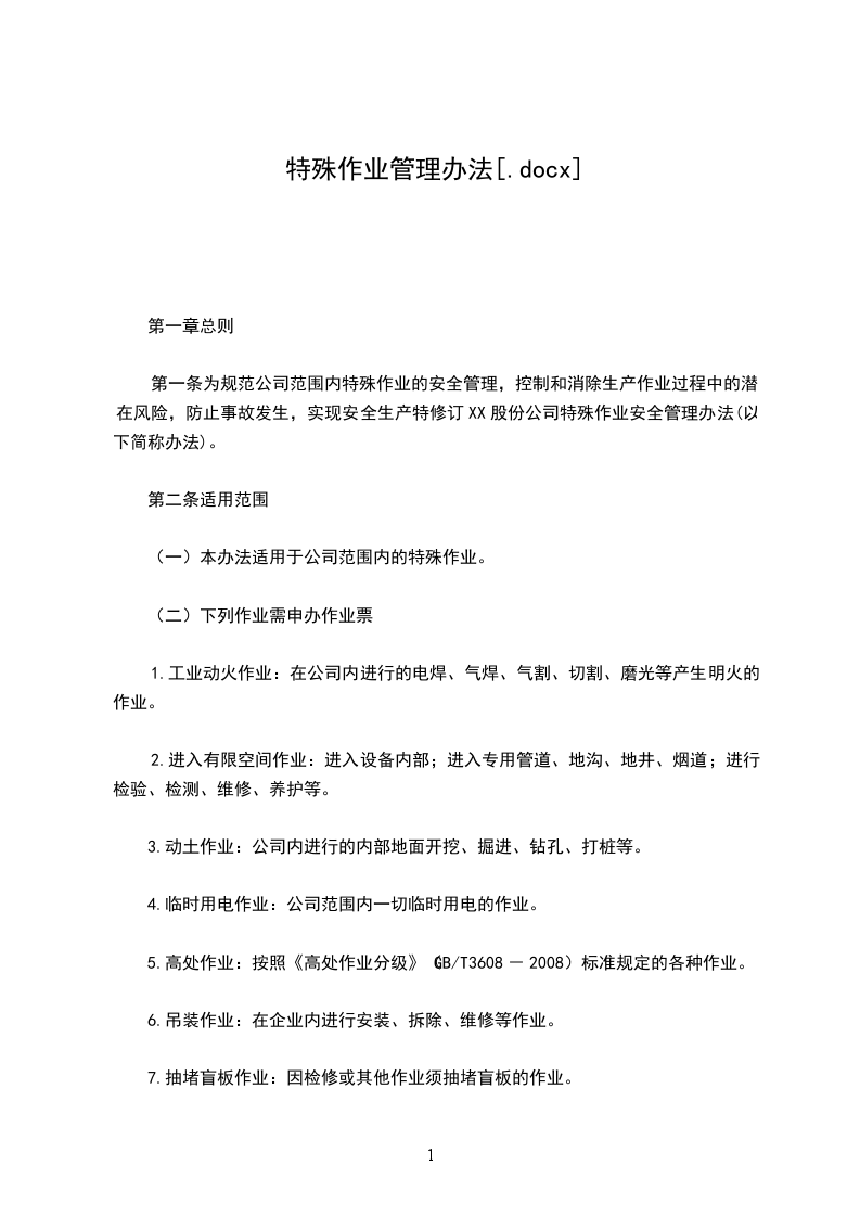 第一条为规范公司范围内特殊作业的安全管理,控制和消除生产作业过程中的潜在风险,防止事故发生,实现安全生产特修订XX股份公司特殊作业安全管理办法(以下简称办法)。