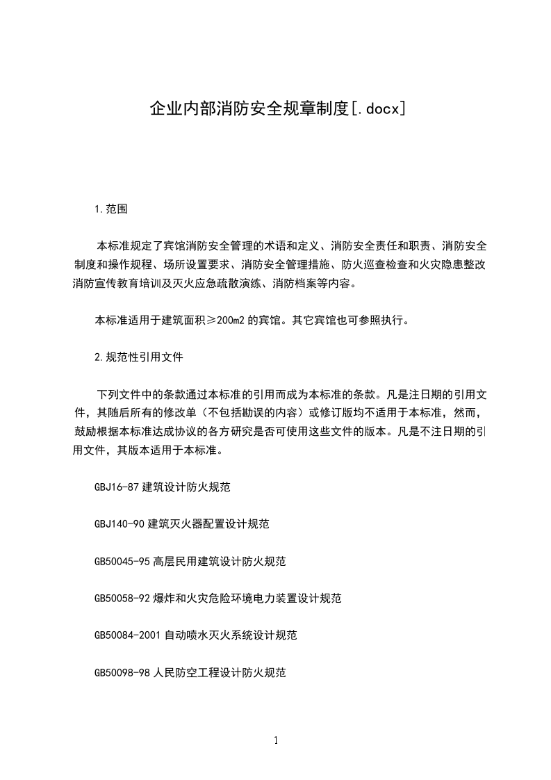 本标准规定了宾馆消防安全管理的术语和定义、消防安全责任和职责、消防安全制度和操作规程、场所设置要求、消防安全管理措施、防火巡查检查和火灾隐患整改、消防宣传教育培训及灭火应急疏散演练、消防档案等内容。