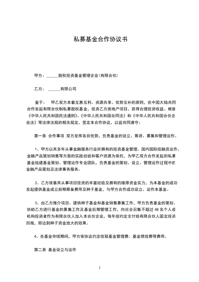 鉴于: 甲乙双方本着互惠互利、资源共享、优势互补的原则,在中国大陆共同合作发起有限合伙制私募股权基金,投资乙方房地产项目,获得合理投资收益。根据《中华人民共和国民法典》和《中华人民共和国合伙企业法》等法律法规的相关规定,签定本合作协议,以兹共同遵守: