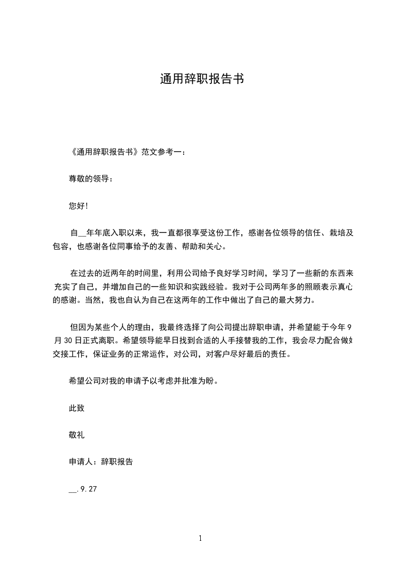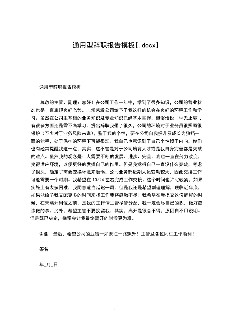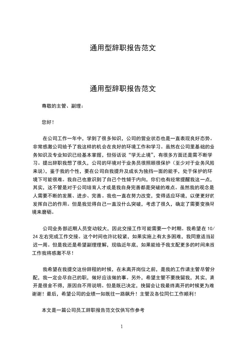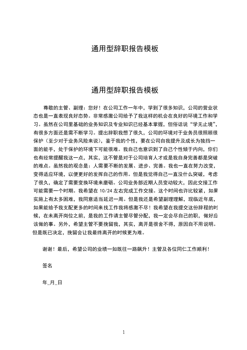 通用型辞职报告模板