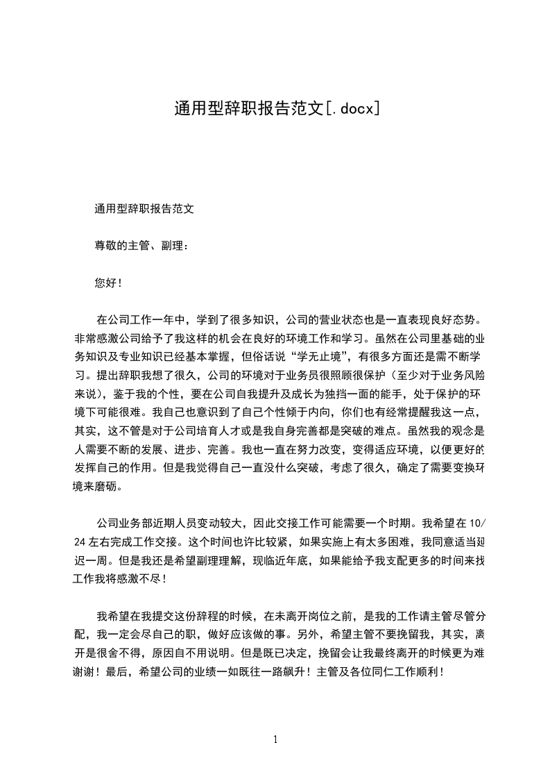 尊敬的主管、副理:您好!在公司工作一年中,学到了很多知识,公司的营业状态也是一直表现良好态势。非常感激公司给予了我这样的机会在良好的环境工作和学习。虽然在公司里基础的业务知识及专业知识已经基本掌握,但俗话说“学无止境”,有很多方面还是需不断学习。提出辞职我想了很久,公司的环境对于业务员很照顾很保护(至少对于业务风险来说),鉴于我的个性,要在公司自我提升及成长为独挡一面的能手,处于保护的环境下可能很难。我自己也意识到了自己个性倾于内向,你们也有经常提醒我这一点,其实,这不管是对于公司培育人才或是我自身完善都是突破的难点。虽然我的观念是:人需要不断的发展、进步、完善。我也一直在努力改变,变得适应环境,以便更好的发挥自己的作用。但是我觉得自己一直没什么突破,考虑了很久,确定了需要变换环境来磨砺。公司业务部近期人员变动较大,因此交接工作可能需要一个时期。我希望在10/24左右完成工作交接。这个时间也许比较紧,如果实施上有太多困难,我同意适当延迟一周。但是我还是希望副理理解,现临近年底,如果能给予我支配更多的时间来找工作我将感激不尽!我希望在我提交这份辞程的时候,在未离开岗位之前,是我的工作请主管尽管分配,我一定会尽自己的职,做好应该做的事。另外,希望主管不要挽留我,其实,离开是很舍不得,原因自不用说明。但是既已决定,挽留会让我最终离开的时候更为难。