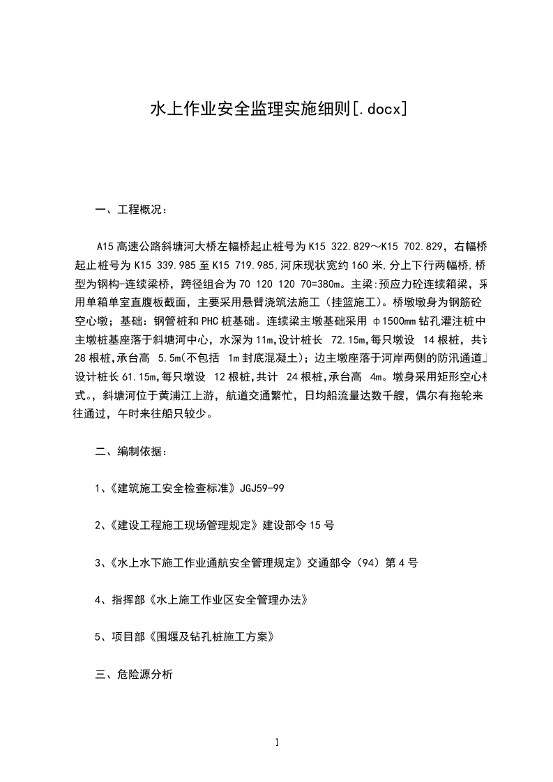 A15高速公路斜塘河大桥左幅桥起止桩号为K15 322.829~K15 702.829,右幅桥起止桩号为K15 339.985至K15 719.985,河床现状宽约160米,分上下行两幅桥,桥型为钢构-连续梁桥,跨径组合为70 120 120 70=380m。主梁:预应力砼连续箱梁,采用单箱单室直腹板截面,主要采用悬臂浇筑法施工(挂篮施工)。桥墩墩身为钢筋砼空心墩;基础:钢管桩和PHC桩基础。连续梁主墩基础采用ф1500mm钻孔灌注桩中主墩桩基座落于斜塘河中心,水深为11m,设计桩长72.15m,每只墩设14根桩,共计28根桩,承台高5.5m(不包括1m封底混凝土);边主墩座落于河岸两侧的防汛通道上,设计桩长61.15m,每只墩设12根桩,共计24根桩,承台高4m。墩身采用矩形空心柱式。,斜塘河位于黄浦江上游,航道交通繁忙,日均船流量达数千艘,偶尔有拖轮来往通过,午时来往船只较少。