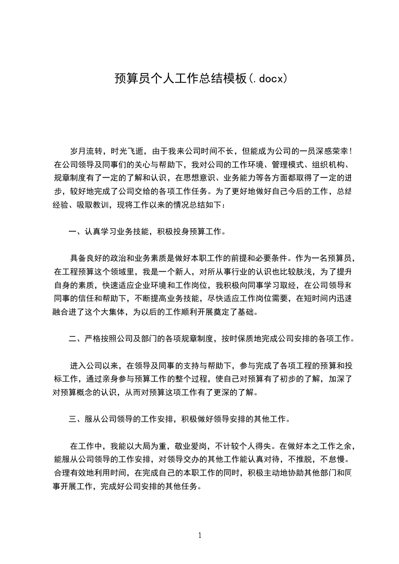 具备良好的政治和业务素质是做好本职工作的前提和必要条件。作为一名预算员,在工程预算这个领域里,我是一个新人,对所从事行业的认识也比较肤浅,为了提升自身的素质,快速适应企业环境和工作岗位,我积极向同事学习取经,在公司领导和同事的信任和帮助下,不断提高业务技能,尽快适应工作岗位需要,在短时间内迅速融合进了这个大集体,为以后的工作顺利开展奠定了基础。