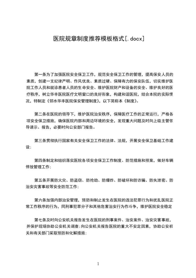 第一条为了加强医院安全保卫工作,规范安全保卫工作的管理,提高保安人员的素质,创建一支纪律严明、作风优良、素质过硬、保障有力的保安队伍,切实维护医院工作人员和就诊患者人员的生命安全、维护医院财产和设备的安全、维护良好的医疗秩序,树立华丰医院医疗文明窗口的良好形象,构建和谐医院,结合本院的实际情况,特制定《邻水华丰医院保安管理制度》,以下简称本《制度》。