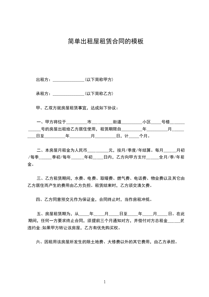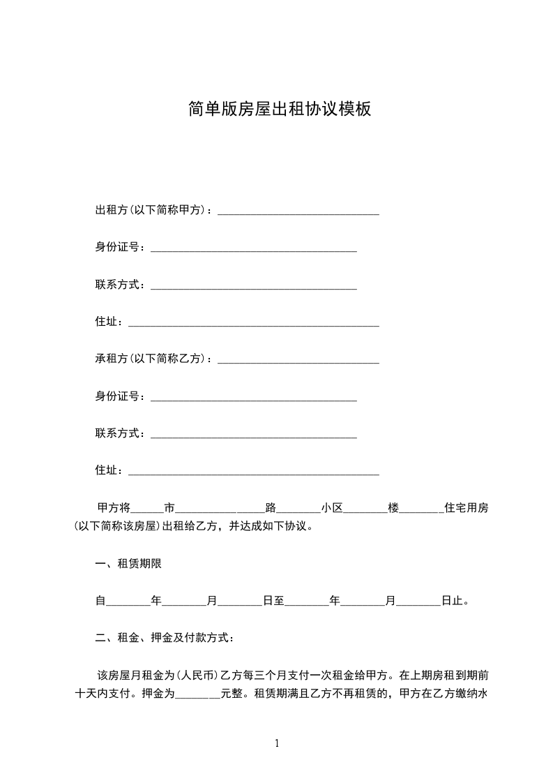 一、甲方将位于____市____街道____小区________号楼________号的房屋出租给乙方居住使用,租赁期限自____年____月____日至____年____月____日,计________个月。