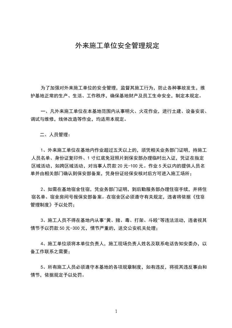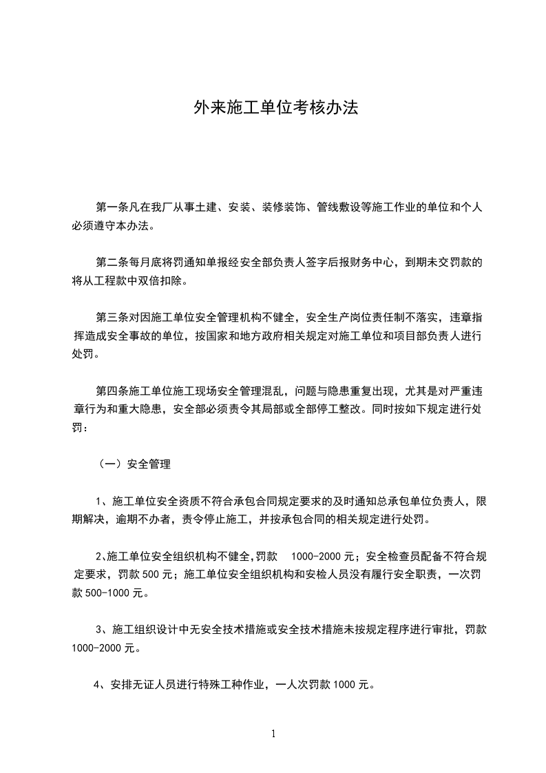 第一条凡在我厂从事土建、安装、装修装饰、管线敷设等施工作业的单位和个人必须遵守本办法。
