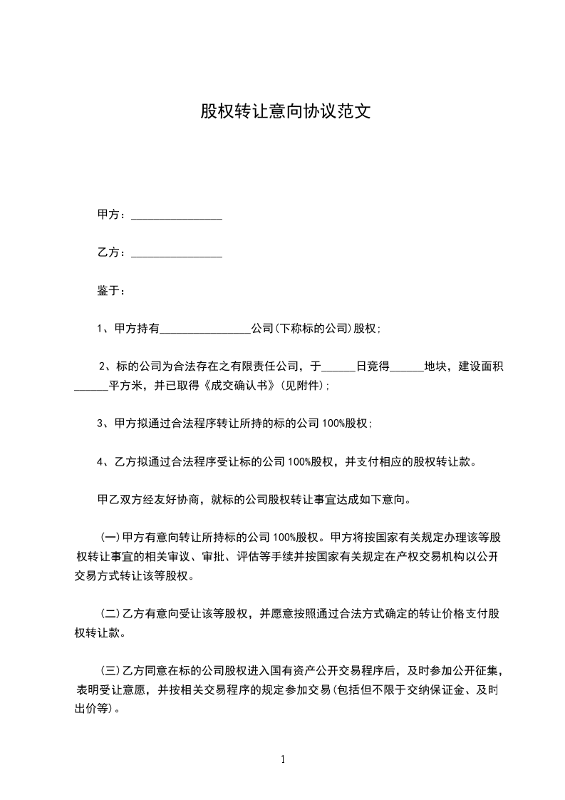 (一)甲方有意向转让所持标的公司100%股权。甲方将按国家有关规定办理该等股权转让事宜的相关审议、审批、评估等手续并按国家有关规定在产权交易机构以公开交易方式转让该等股权。