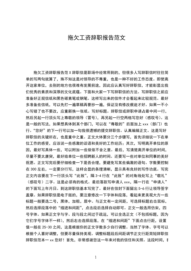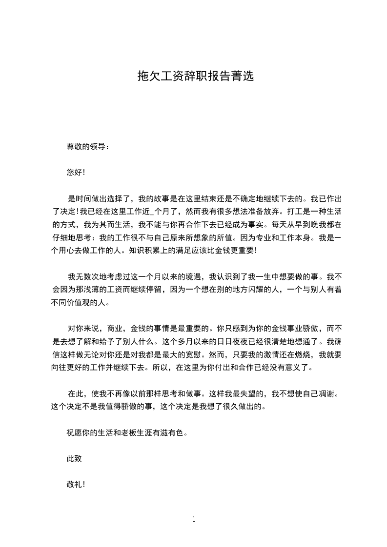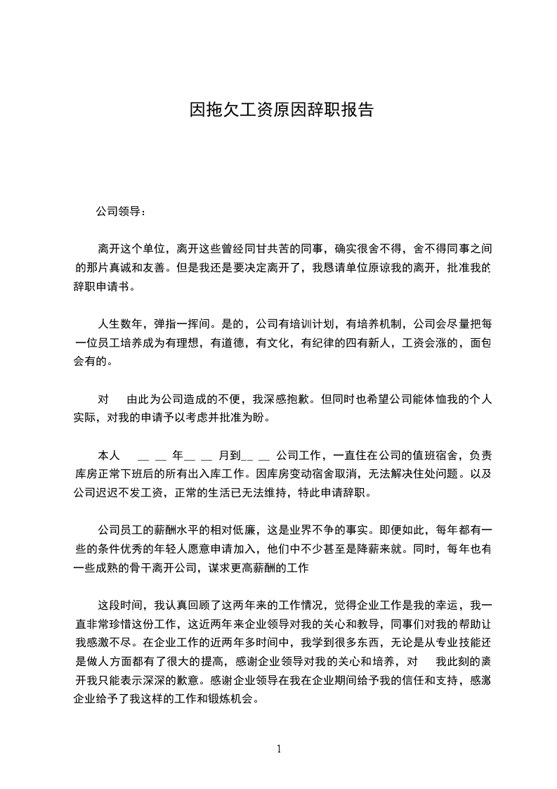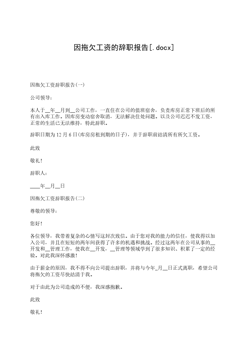 拖欠工资辞职报告(三)