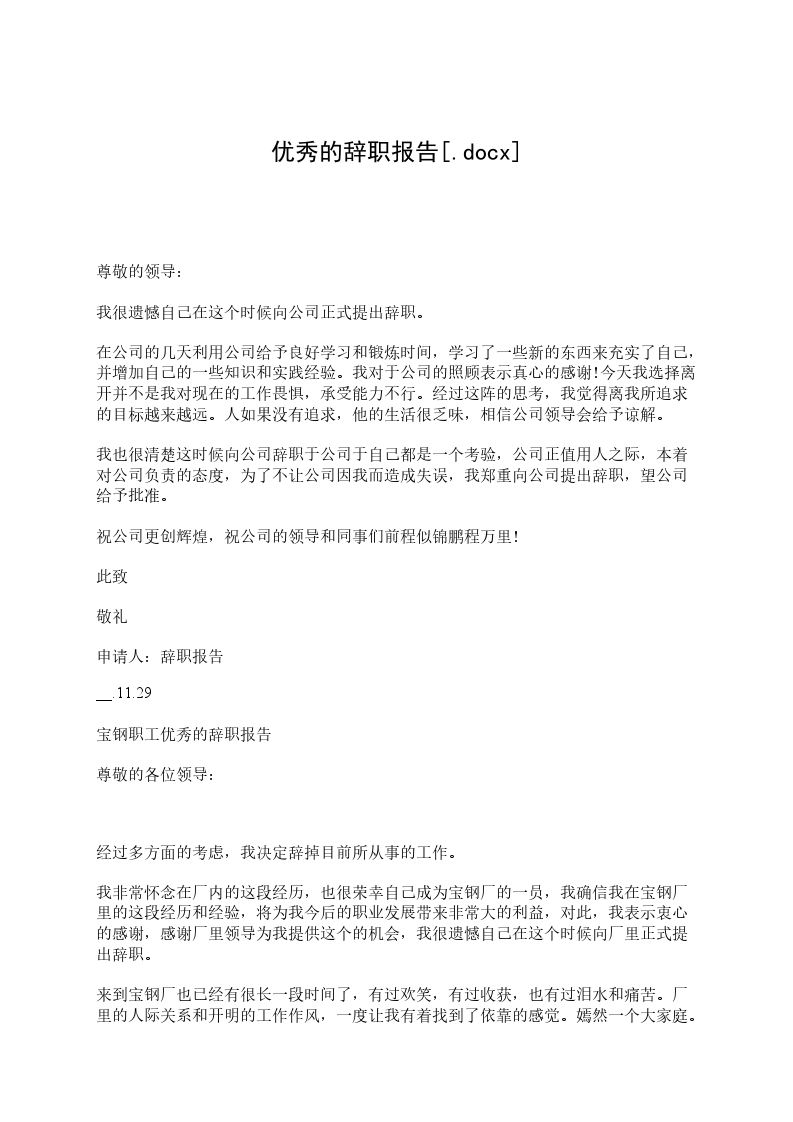 宝钢职工优秀的辞职报告