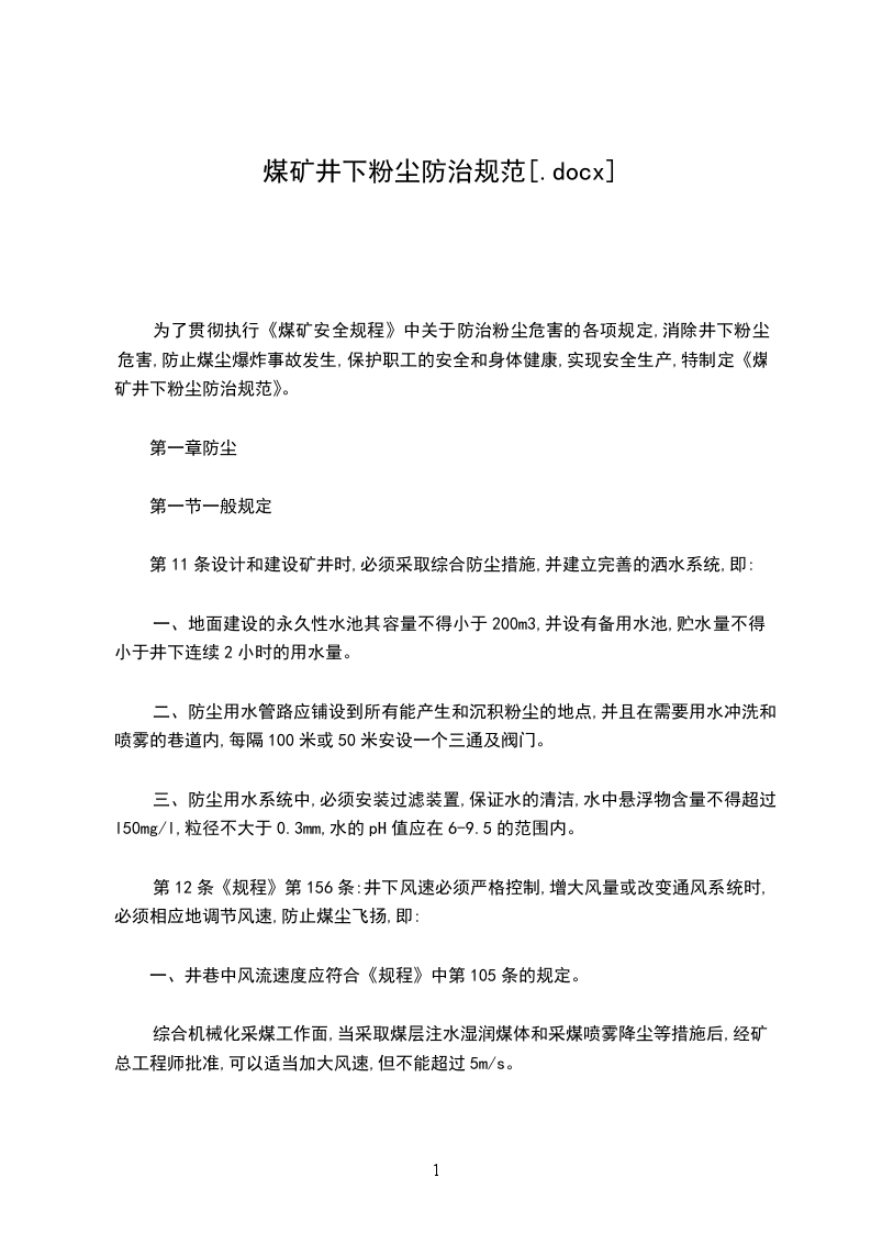为了贯彻执行《煤矿安全规程》中关于防治粉尘危害的各项规定,消除井下粉尘危害,防止煤尘爆炸事故发生,保护职工的安全和身体健康,实现安全生产,特制定《煤矿井下粉尘防治规范》。
