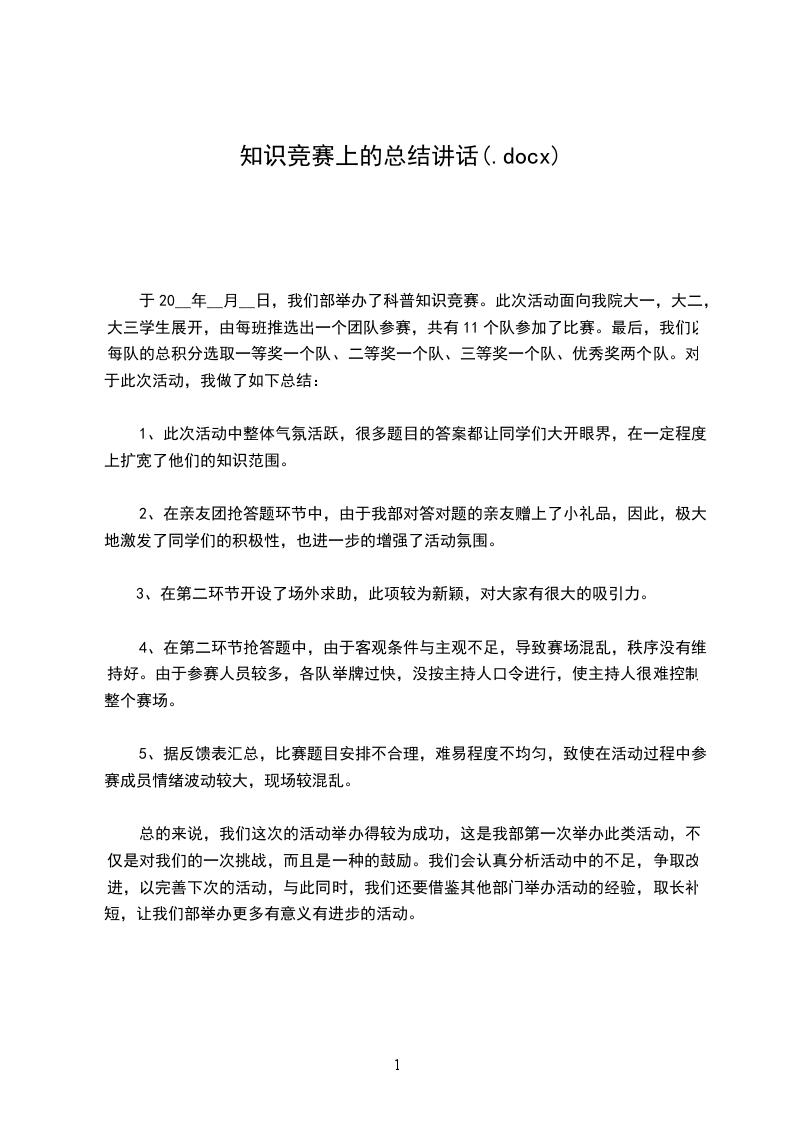 于20__年__月__日,我们部举办了科普知识竞赛。此次活动面向我院大一,大二,大三学生展开,由每班推选出一个团队参赛,共有11个队参加了比赛。最后,我们以每队的总积分选取一等奖一个队、二等奖一个队、三等奖一个队、优秀奖两个队。对于此次活动,我做了如下总结: