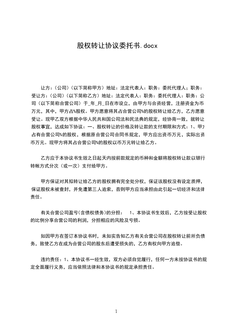2、甲方委托股权转让业务成交后,应由甲方与买受人签订相应合同,并严格履行,由此产生的权利、义务均由甲方与买受人自行承担。乙方不承担任何连带责任。