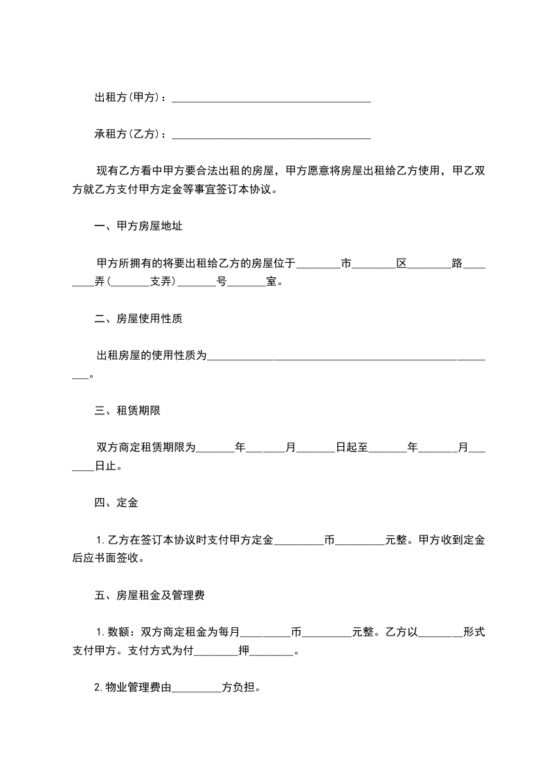 现有乙方看中甲方要合法出租的房屋,甲方愿意将房屋出租给乙方使用,甲乙双方就乙方支付甲方定金等事宜签订本协议。