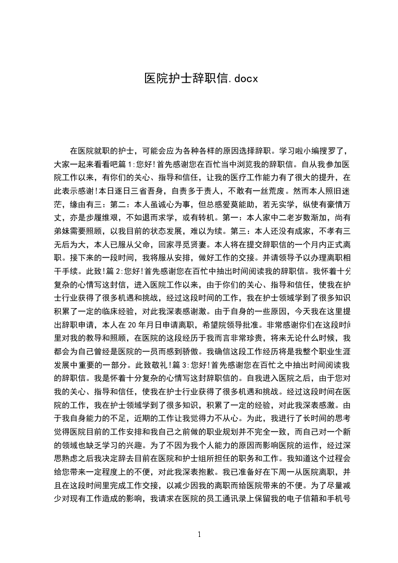 我是怀着十分的心情写这封辞职信的。自我进入医院之后,由于您对我的关心、指导和信任,使我在护士行业获得了很多机遇和挑战。经过这段时间在医院的工作,我在护士领域学到了很多知识,积累了一定的经验,对此我深表感谢。