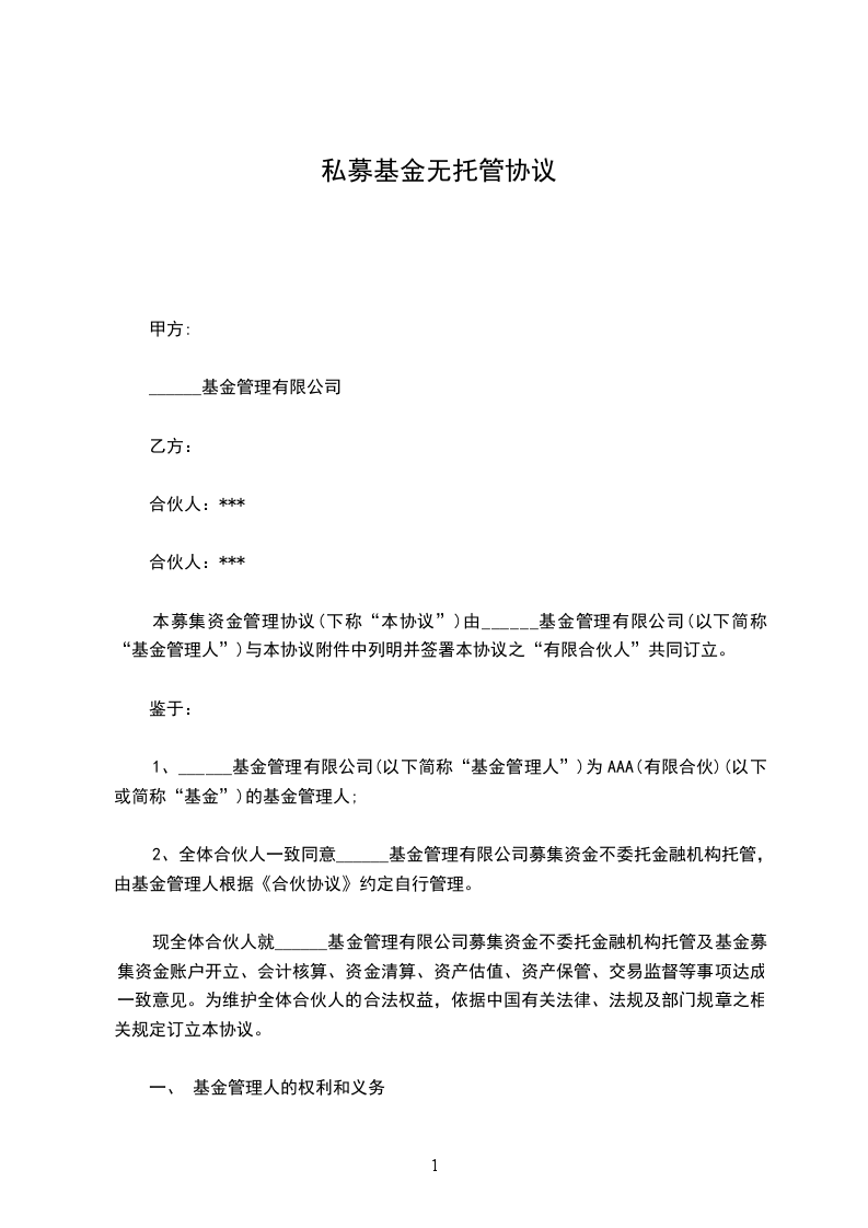 现全体合伙人就______基金管理有限公司募集资金不委托金融机构托管及基金募集资金账户开立、会计核算、资金清算、资产估值、资产保管、交易监督等事项达成一致意见。为维护全体合伙人的合法权益,依据中国有关法律、法规及部门规章之相关规定订立本协议。