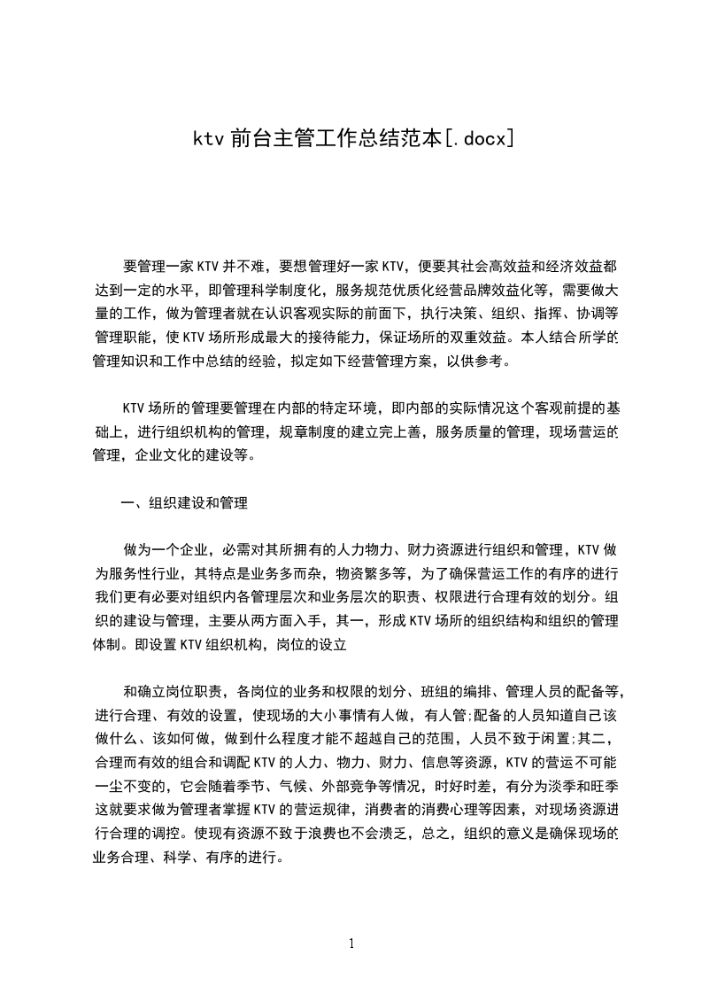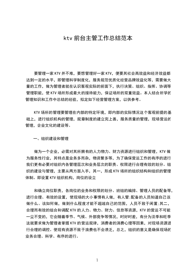 做为一个企业,必需对其所拥有的人力物力、财力资源进行组织和管理,KTV做为服务性行业,其特点是业务多而杂,物资繁多等,为了确保营运工作的有序的进行。我们更有必要对组织内各管理层次和业务层次的职责、权限进行合理有效的划分。组织的建设与管理,主要从两方面入手,其一,形成KTV场所的组织结构和组织的管理体制。即设置KTV组织机构,岗位的设立