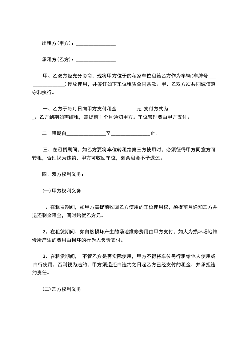 甲、乙双方经充分协商,现将甲方位于的私家车位租给乙方作为车辆(车牌号________________)停放使用,并签订如下车位租赁合同条款。甲、乙双方须共同诚信遵守和执行。