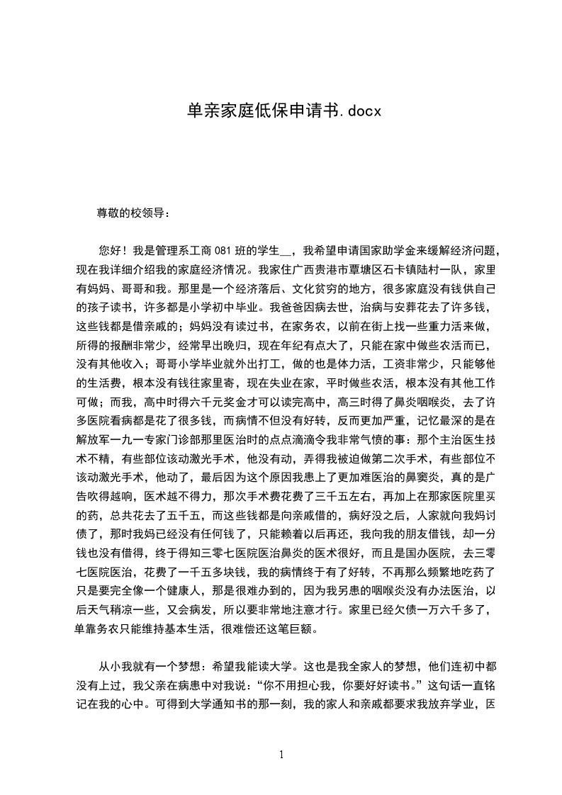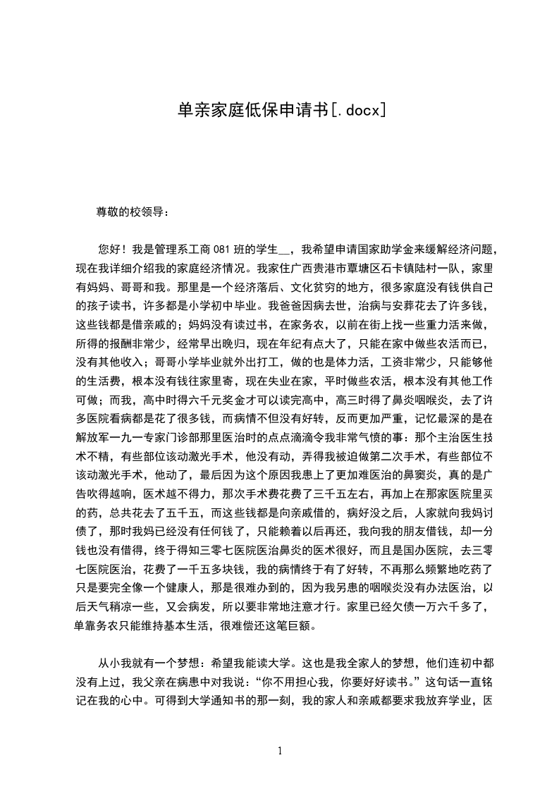您好!我是管理系工商081班的学生__,我希望申请国家助学金来缓解经济问题,现在我详细介绍我的家庭经济情况。我家住广西贵港市覃塘区石卡镇陆村一队,家里有妈妈、哥哥和我。那里是一个经济落后、文化贫穷的地方,很多家庭没有钱供自己的孩子读书,许多都是小学初中毕业。我爸爸因病去世,治病与安葬花去了许多钱,这些钱都是借亲戚的;妈妈没有读过书,在家务农,以前在街上找一些重力活来做,所得的报酬非常少,经常早出晚归,现在年纪有点大了,只能在家中做些农活而已,没有其他收入;哥哥小学毕业就外出打工,做的也是体力活,工资非常少,只能够他的生活费,根本没有钱往家里寄,现在失业在家,平时做些农活,根本没有其他工作可做;而我,高中时得六千元奖金才可以读完高中,高三时得了鼻炎咽喉炎,去了许多医院看病都是花了很多钱,而病情不但没有好转,反而更加严重,记忆最深的是在解放军一九一专家门诊部那里医治时的点点滴滴令我非常气愤的事:那个主治医生技术不精,有些部位该动激光手术,他没有动,弄得我被迫做第二次手术,有些部位不该动激光手术,他动了,最后因为这个原因我患上了更加难医治的鼻窦炎,真的是广告吹得越响,医术越不得力,那次手术费花费了三千五左右,再加上在那家医院里买的药,总共花去了五千五,而这些钱都是向亲戚借的,病好没之后,人家就向我妈讨债了,那时我妈已经没有任何钱了,只能赖着以后再还,我向我的朋友借钱,却一分钱也没有借得,终于得知三零七医院医治鼻炎的医术很好,而且是国办医院,去三零七医院医治,花费了一千五多块钱,我的病情终于有了好转,不再那么频繁地吃药了,只是要完全像一个健康人,那是很难办到的,因为我另患的咽喉炎没有办法医治,以后天气稍凉一些,又会病发,所以要非常地注意才行。家里已经欠债一万六千多了,单靠务农只能维持基本生活,很难偿还这笔巨额。