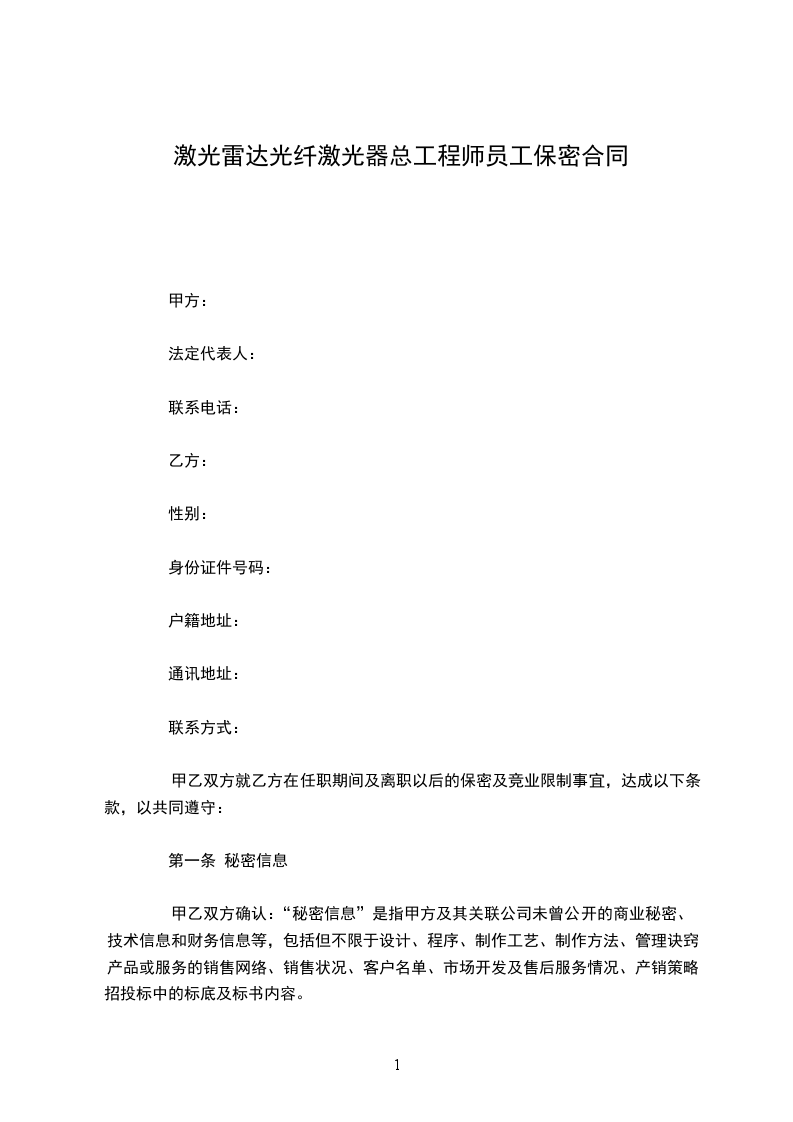 激光雷达光纤激光器总工程师员工保密合同