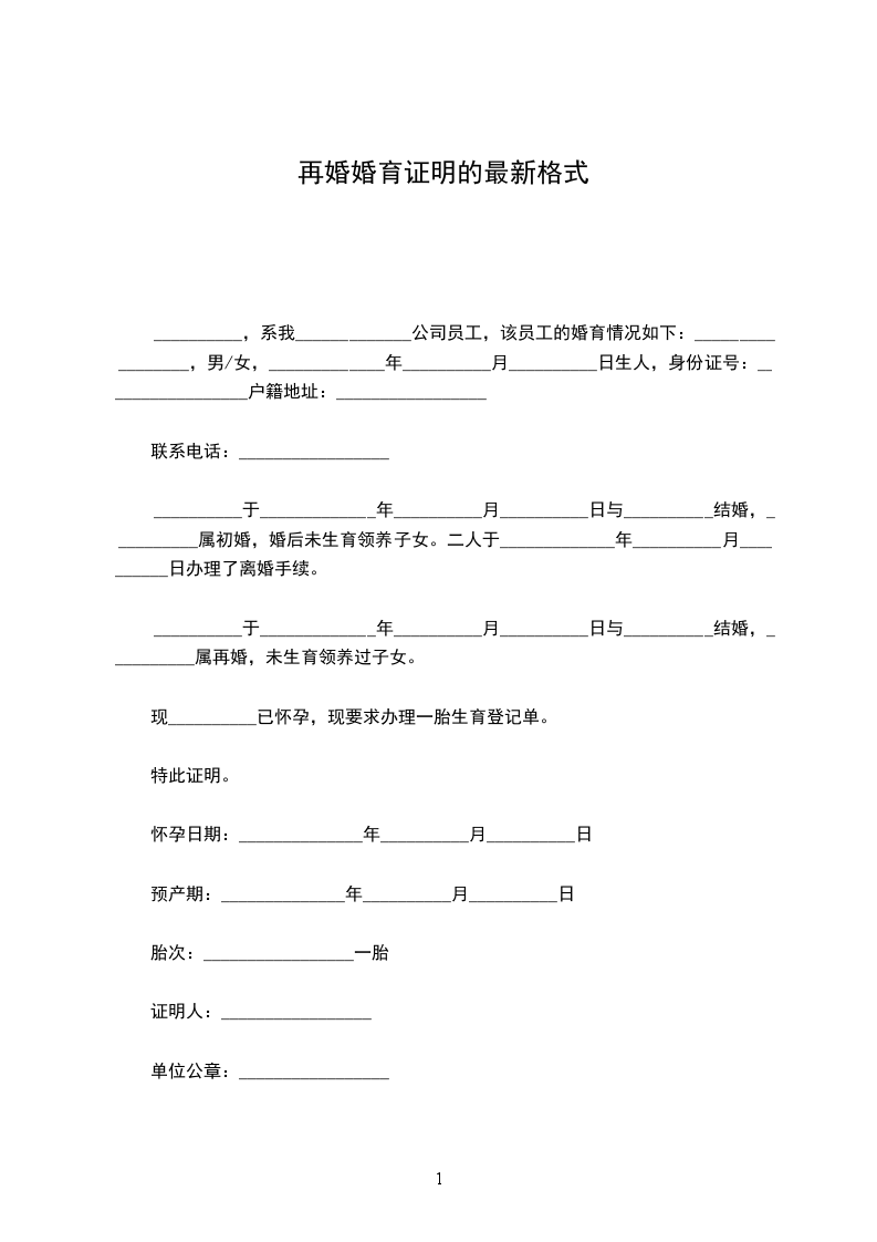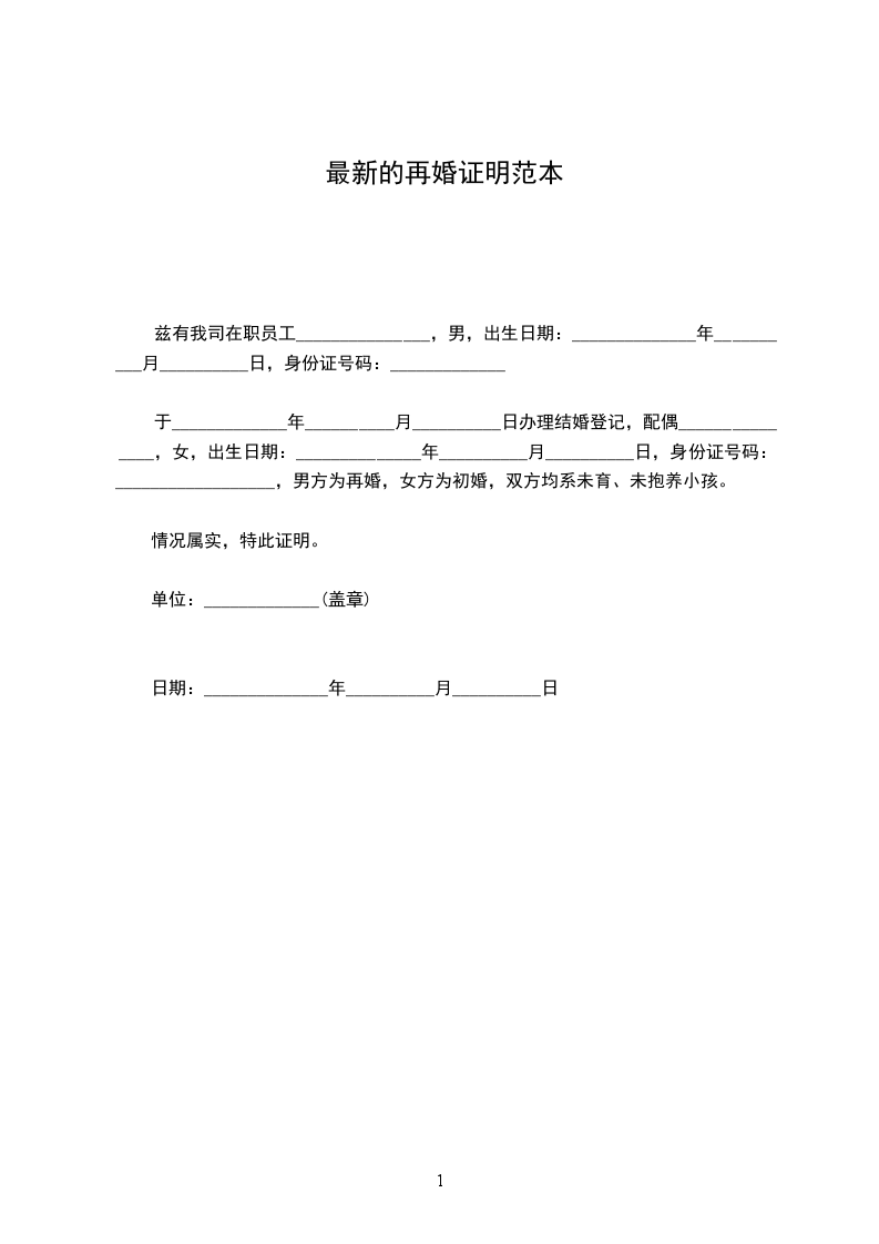 兹证明我单位(或本辖区)_________,男/女,___________年____月____日出生,自___________年____月____日与________离婚后,至今日止(或至___________年____月____日离境之日止)未再登记结婚。