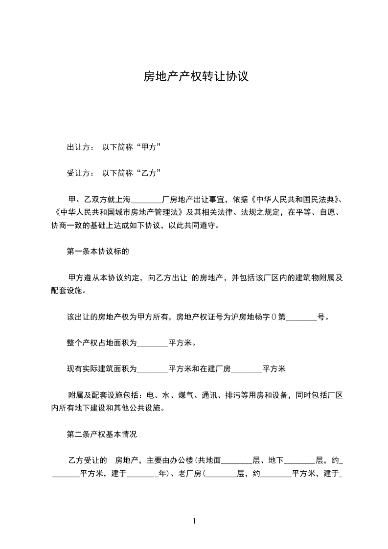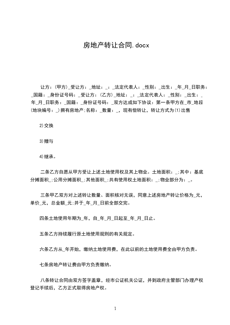 第一条 甲方在______________市______________地段(地块编号:______________)拥有房地产;名称: ______________数量:______________,现有偿转让,转让方式为(1)出售(2)交换(3)赠与(4)继承。