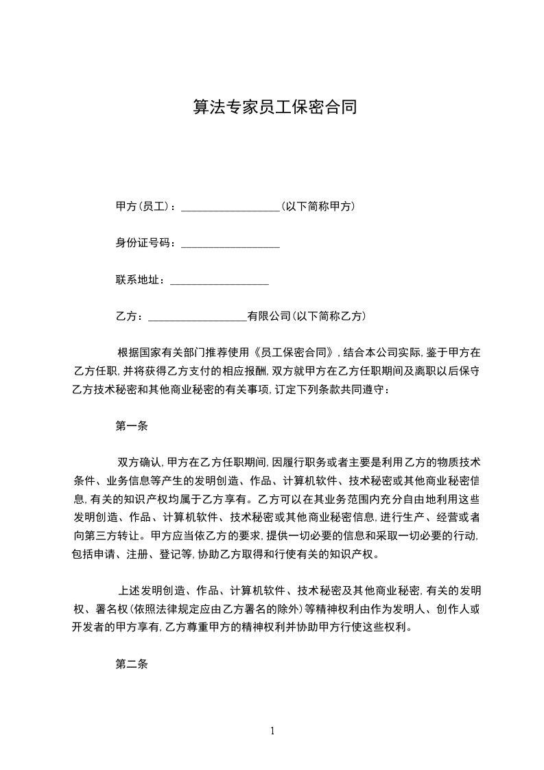 根据国家有关部门推荐使用《员工保密合同》,结合本公司实际,鉴于甲方在乙方任职,并将获得乙方支付的相应报酬,双方就甲方在乙方任职期间及离职以后保守乙方技术秘密和其他商业秘密的有关事项,订定下列条款共同遵守: