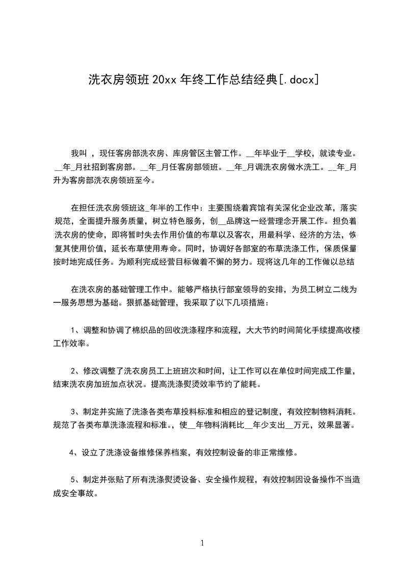 在担任洗衣房领班这_年半的工作中:主要围绕着宾馆有关深化企业改革,落实规范,全面提升服务质量,树立特色服务,创__品牌这一经营理念开展工作。担负着洗衣房的使命,即将暂时失去作用价值的布草以及客衣,用最科学、经济的方法,恢复其使用价值,延长布草使用寿命。同时,协调好各部室的布草洗涤工作,保质保量按时地完成任务。为顺利完成经营目标做着不懈的努力。现将这几年的工作做以总结。