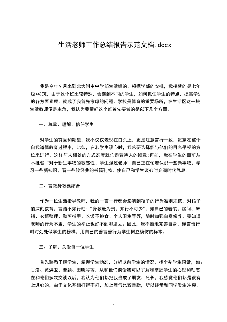 3、个人生活指导:包括帮助学生正确认识人生的意义和价值,培养积极向上的生活态度;尊重和体谅他人,能帮父母分忧,与父母同享快乐;懂得保护自己。在平时的工作中,我注重关心孩子们的健康成长,一有高度的责任心,二是勤快不怕脏,三是有一套科学有效的管理办法。学校规定的《生活教师职责》要求负责学生有生活时段的安全及卫生工作,在这方面我坚持早、中、晚清点人数,特别是晚上我要查几次,直到学生全部睡熟我才放心离开,夜里还要起来叫年龄小的孩子小便。