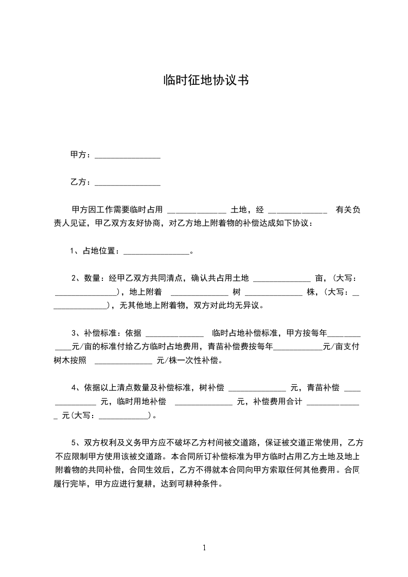 甲方因工作需要临时占用 ______________ 土地,经 ______________ 有关负责人见证,甲乙双方友好协商,对乙方地上附着物的补偿达成如下协议: