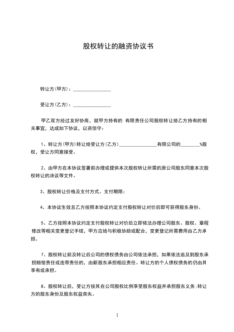 1、转让方(甲方)转让给受让方(乙方)有限公司的_______________%股权,受让方同意接受。