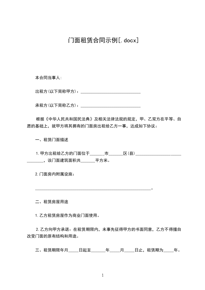 根据《中华人民共和国民法典》及相关法律法规的规定,甲、乙双方在平等、自愿的基础上,就甲方将其拥有的门面房出租给乙方一事,达成如下协议: