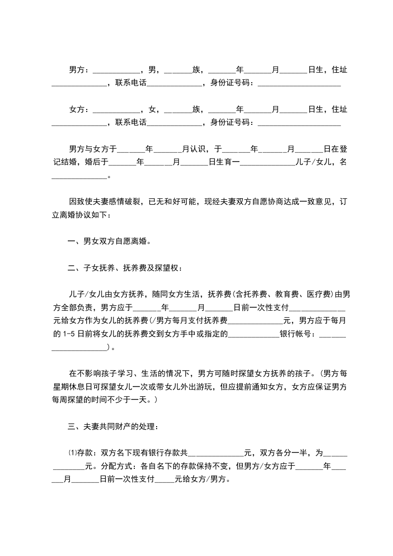 1、双方于______年______月______日生育有一儿子/女儿,取名:______,离婚后儿子/女儿随男方/女方直接抚养生活,由女方/男方每月给付抚养费(包括生活费、教育费、医疗费)______元,在每月______号前付清,直到孩子完成高中教育阶段止。高中教育阶段之后的有关费用双方日后重新协商。
