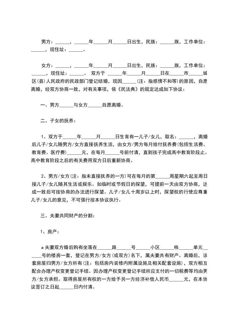 女方:______,______年______月______日出生,民族:______族,工作单位:______,现住址:______。 双方于 ______年______月______日在______市______城区(县)人民政府的民政部门登记结婚,现因______(注:指感情不和等)的原因,自愿离婚,经双方协商一致,对有关事项,依《民法典》的规定达成如下协议: