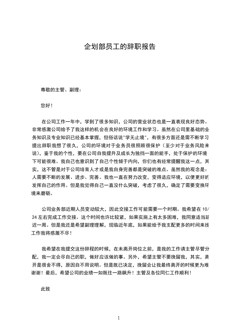 在公司工作一年中,学到了很多知识,公司的营业状态也是一直表现良好态势。非常感激公司给予了我这样的机会在良好的环境工作和学习。虽然在公司里基础的业务知识及专业知识已经基本掌握,但俗话说"学无止境",有很多方面还是需不断学习。提出辞职我想了很久,公司的环境对于业务员很照顾很保护(至少对于业务风险来说),鉴于我的个性,要在公司自我提升及成长为独挡一面的能手,处于保护的环境下可能很难。我自己也意识到了自己个性倾于内向,你们也有经常提醒我这一点,其实,这不管是对于公司培育人才或是我自身完善都是突破的难点。虽然我的观念是:人需要不断的发展、进步、完善。我也一直在努力改变,变得适应环境,以便更好的发挥自己的作用。但是我觉得自己一直没什么突破,考虑了很久,确定了需要变换环境来磨砺。