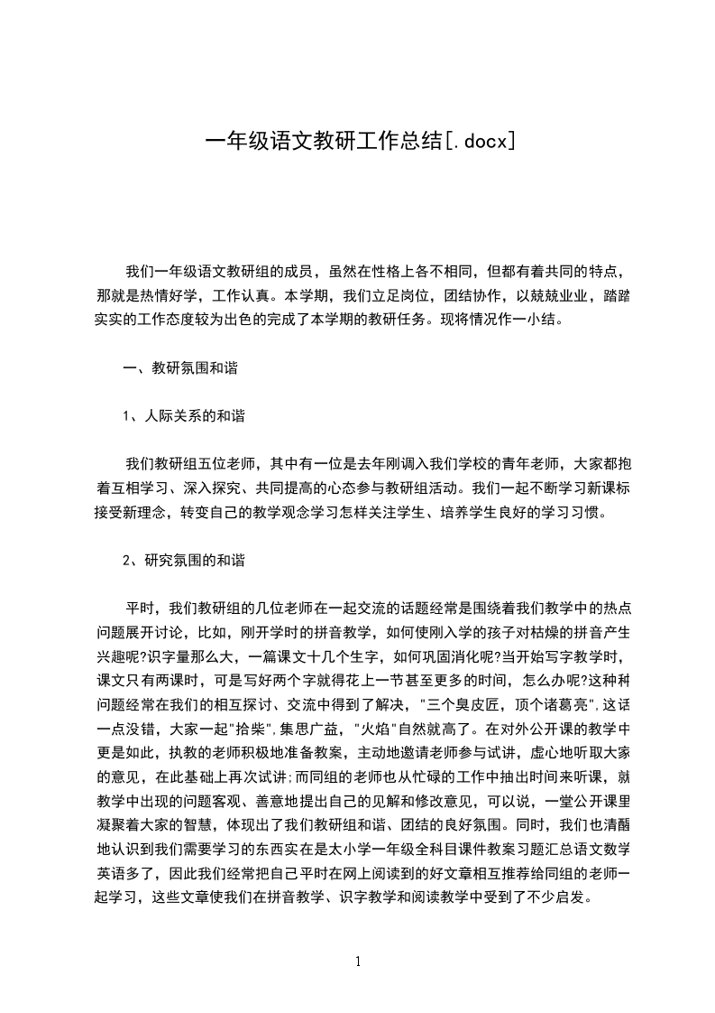 我们一年级语文教研组的成员,虽然在性格上各不相同,但都有着共同的特点,那就是热情好学,工作认真。本学期,我们立足岗位,团结协作,以兢兢业业,踏踏实实的工作态度较为出色的完成了本学期的教研任务。现将情况作一小结。